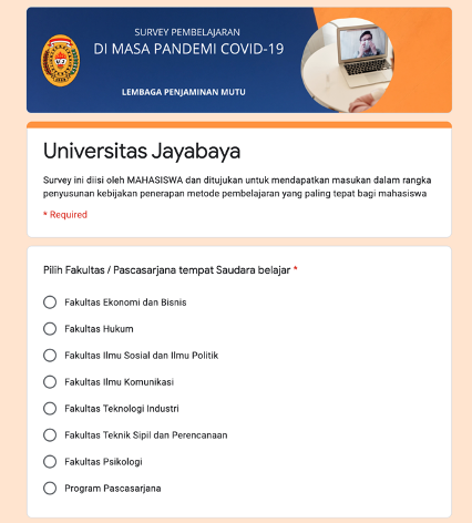 Hasil masukan Mahasiswa dari survey akan menjadi salah satu dasar Pimpinan Universitas untuk menetapkan kebijakan tentang pembelajaran daring di Universitas Jayabaya ke depan.