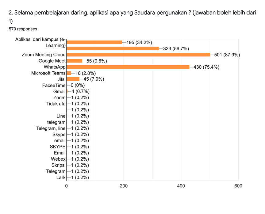 Lembaga Penjaminan Mutu (LPM) Universitas Jayabaya mengadakan kegiatan survey terkait pembelajaran di masa Covid 19 di Universitas Jayabaya. Survey diikuti oleh 570 responden mahasiswa Universitas Jayabaya yang meliputi Fak. Hukum (FH), Fak. Ekonomi dan Bisnis (FEB), Fak. Ilmu Sosial dan Ilmu Politik (FISIP), Fak. Teknologi Industri (FTI), Fak. Teknik Sipil dan Perencanaan (FTSP), Fak. Ilmu Komunikasi (Fikom, Fak. Psikologi (FPsi) dan Program Pascasarjana (Magister dan Doktor). Survey dilaksanakan secara daring pada tanggal 4 - 7 Juni 2020, dengan asumsi mahasiswa telah mengalami pembelajaran secara daring dalam waktu 10 minggu di kampus. Diberikan 9 pertanyaan kepada Mahasiswa, yang terdiri dari pertanyaan tertutup dan terbuka. Pertanyaan berfokus pada pengalaman belajar selama mengikuti proses pembelajaran daring yang diselenggarakan oleh Universitas Jayabaya, alasan jawaban yang diberikan serta masukan yang mereka berikan untuk perbaikan sistem pembelajaran daring. Hasil survey disajikan dalam grafik pada gambar berikut.